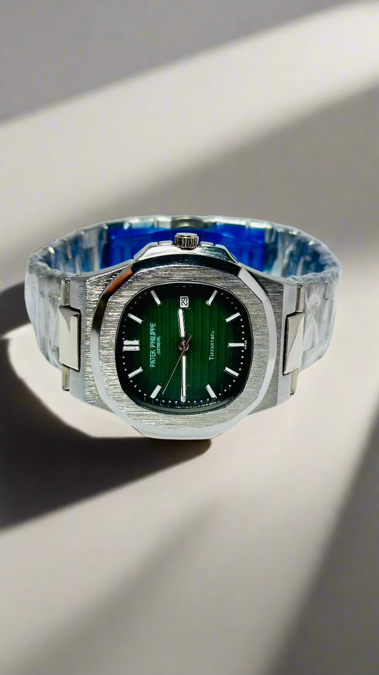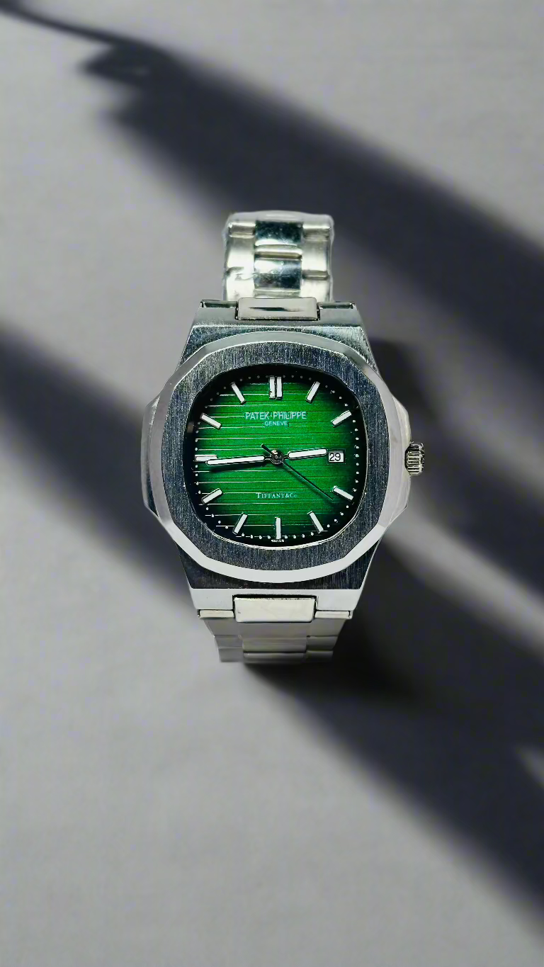 Elevate your style with this Nautilus-inspired men's watch, designed for those who value sophistication and standout design. Featuring a vibrant green sunburst dial, polished stainless steel case, and integrated bracelet, this timepiece delivers the look and feel of high-end luxury—without the premium price tag.