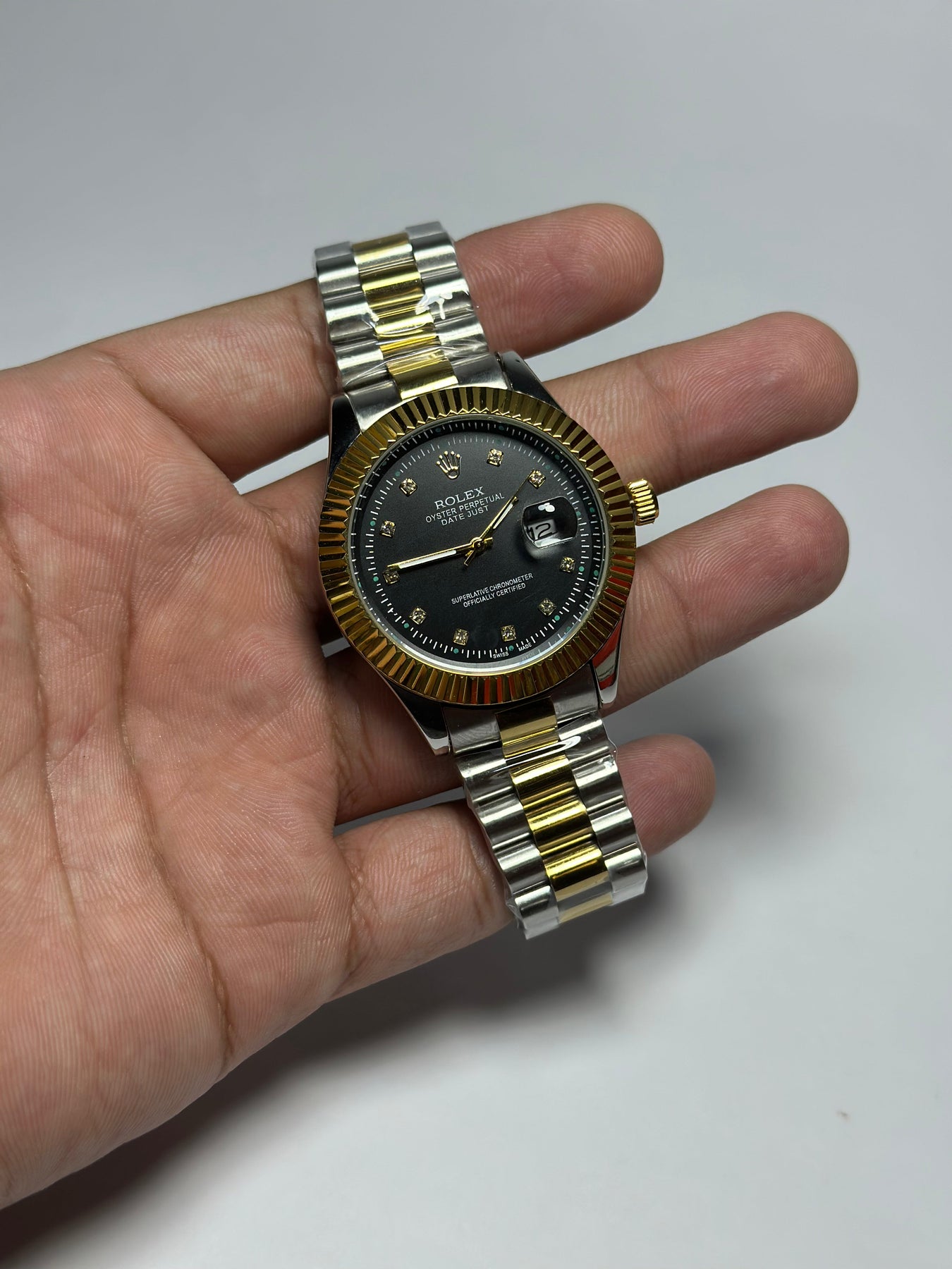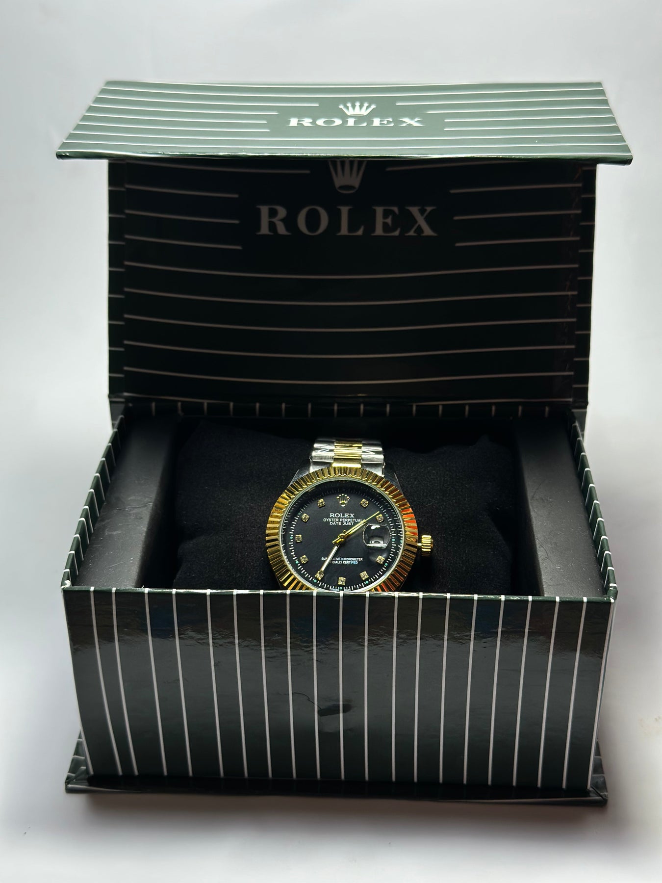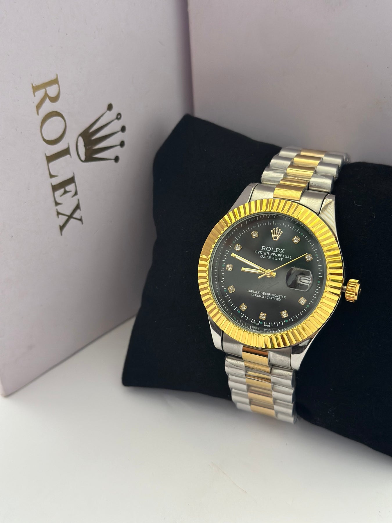 Elevate your style with this premium Rolex Datejust replica watch, designed for those who appreciate timeless elegance without the premium price tag. This model features a bold black dial with diamond-style hour markers, giving it a luxurious and sophisticated appearance. The classic two-tone design, combining stainless steel and gold-plated accents, makes this watch stand out with refined flair.